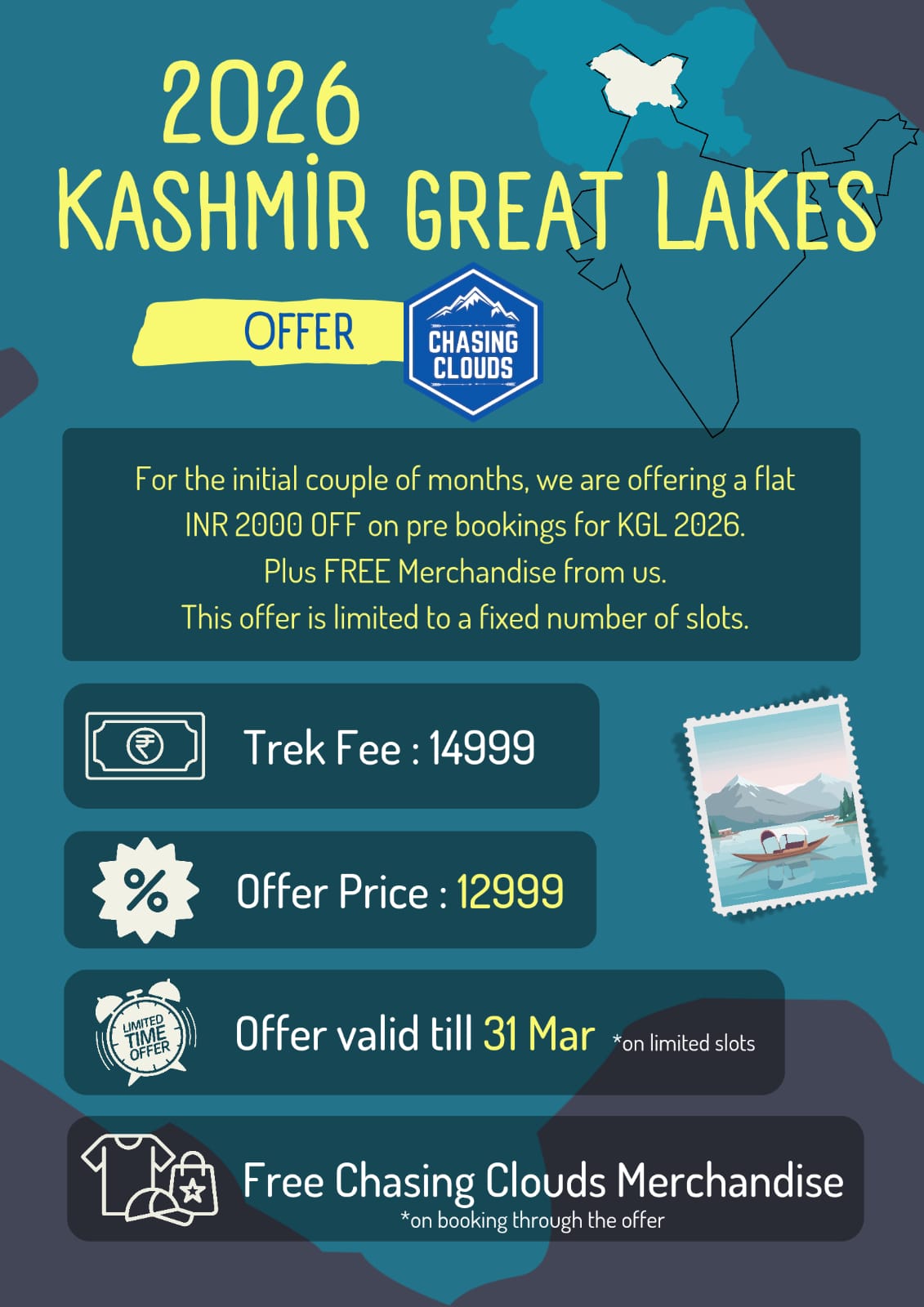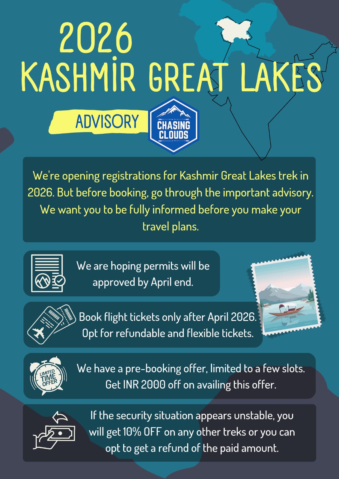 The trek begins at Shitkadi, which is a few kilometres ahead of Sonamarg. Reach Srinagar and meet the Chasing Clouds team approx at 1 pm. The drive to the base camp will take around 4 hours.